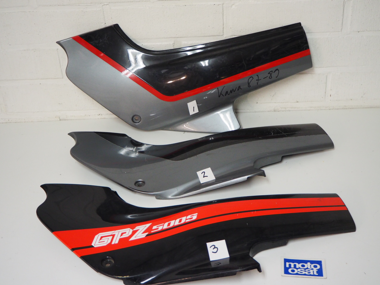 3904 - Kawasaki GPZ 500 S -88 vasen sivukate 36001-1348 - hinta 40€ kpl - numerossa 3 kiinnikevaurio, hinta 30 € 3904